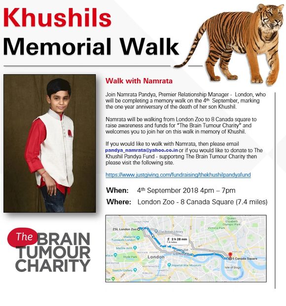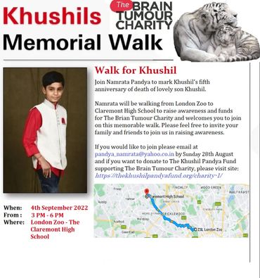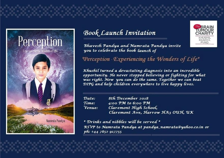 Khushil's Fundraiser is being held this Saturday in Hammersmith Shopping Mall. A great opportunity to learn more about The Khushil Pandya Fund fight to defeat DIPG. A rare brain tumour often found in children, it started off as a squint in his eye. Fighting a battle against a disease that has no cure or medication. Khushil fought his diagnosis of being given 6-9months to live and fought on for 2 and half years, inspiring his family to continue the fight to find a cure and fund research. 100% of this funding is designated to DIPG research. Come and along and support us. Meet the author of Perception - Namrata - a truly inspirational individual.